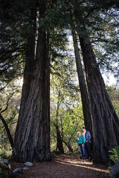 Jones and Krayacich pose beside a towering redwood tree during their stop in northern California.