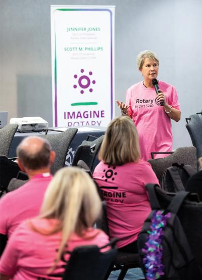 At a training seminar for Rotary club presidents-elect at a Dallas-area hotel in February, sergeants-at-arms wearing yellow vests and Stetsons lead participants, grouped by Rotary district, into a small room for a photo op with 2022-23 Rotary International President Jennifer Jones. As the groups enter, the club leaders mob Jones — the room a flurry of handshakes, fist bumps, hugs, and the occasional squeal. For each photo, the Stetson-clad Rotarians (nicknamed "Rangers") give instructions on who should stand where, then Jones, who is seated front-row center, stands up, turns around, and warms up the crowd. "Is this the best district?" she asks one. She challenges a district to dance, busting a groove on the tan and gray patterned hotel carpet. Another, she teases, is the best looking. And then there's the "party" district, whose members give a raucous cheer.