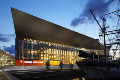 The Melbourne Convention and Exhibition Centre and the Polly Woodside ship-turned-museum.