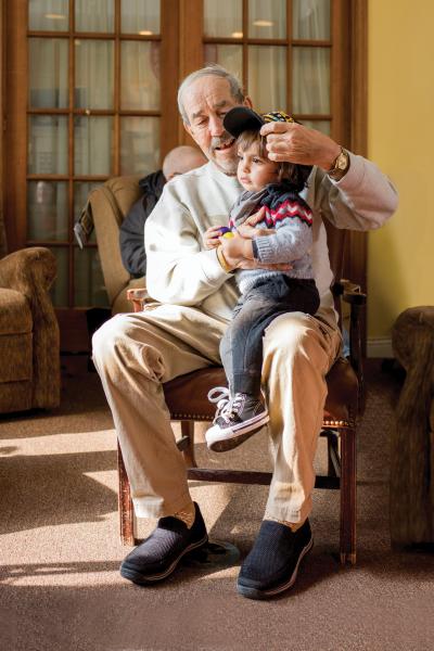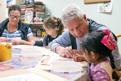 It’s nearly Valentine’s Day. Seated around a table are five older adults and four children under age four, the decades between them bridged by the heart-filled sheets they’re coloring together. One boy holds up his creation. “Look at mine!” he says. Everyone at the table claps, and Bob Husslein offers some grandfatherly words of encouragement: “In the lines, too!” One by one, the kids show off their artwork. “I can’t believe you did that all by yourself,” Husslein says to a little girl. “Are you going to give it to your mommy?”