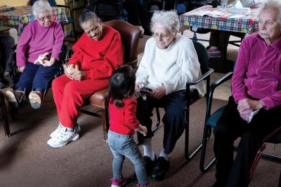 One of the keys to bringing generations together is proximity, and that’s where a place like St. Ann Center — with its balance of both formal intergenerational programs, such as dances and music classes, and informal moments of laughter and greetings — fits in. “Sister Edna has been visionary,” Butts says.