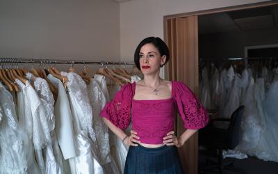Against a backdrop of wedding dresses, Fraidy Reiss stands defiantly inside the Unchained at Last office.