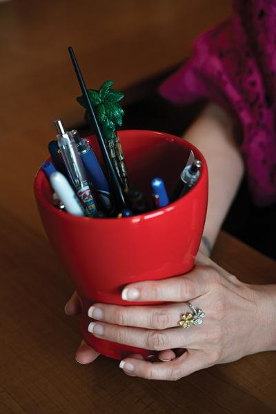 A cup containing pens that were collected each time a state ended child marriage, some of which were used to sign the legislation. Image credit: Sydney Walsh