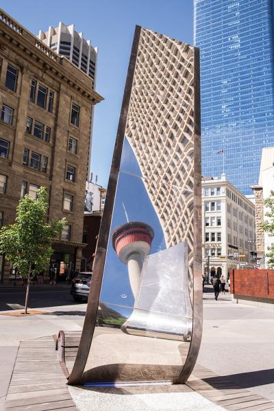 The Calgary Tower is reflected in one of the many pieces of public art in the city’s downtown.