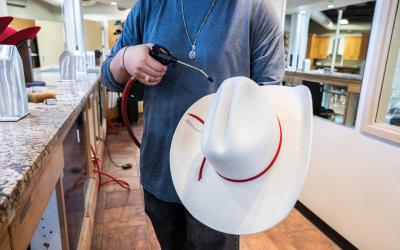 Steve McDonough, past president of the Calgary Stampede, and Wilkinson, a member of the Rotary Club of Calgary at Stampede Park, stop by Smithbilt Hats, where one of the city’s signature white hats is steamed.