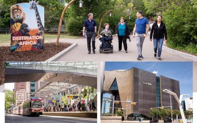 Top: From left, Mark Starratt and his son Alex enjoy the Calgary Zoo, joined by Rotarians Luanne Whitmarsh, Craig Stokke, and Corinne Wilkinson. Starratt and Stokke are co-chairs of the Host Organization Committee. Bottom left: Calgary’s light rail system is part of the city’s public transportation network. Bottom right: Studio Bell is home to the Canadian Music Hall of Fame.