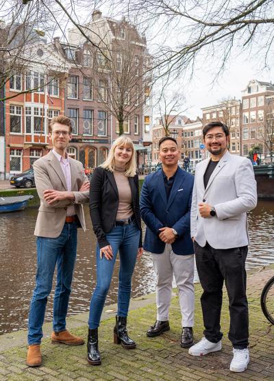 Os associados do Rotaract Club de Amsterdam Nachtwacht International se tornaram especialistas na realização de eventos de arrecadação de fundos para apoiar causas em outras partes do mundo. A partir da esquerda: Oliver Crazzolara, Carolin Vetter, Jerson Ganza e Subhodip Banerjee.