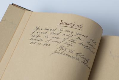 Gli ospiti hanno firmato il libro per molti anni. Include un calendario del 1915, insieme a frasi che vanno dal 1919 in poi. Anche se alcuni ospiti hanno firmato semplicemente con il loro nome e annotato solo le date delle visite, altri hanno lasciato messaggi più lunghi. Le pagine offrono riflessioni su amicizia, connessioni durature e ciò che i soci amavano del Rotary.