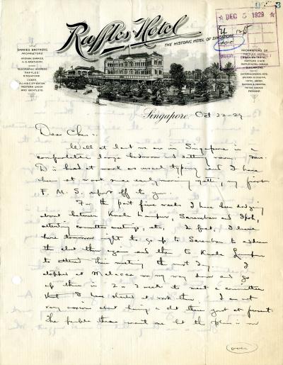 Davidson’s proposed itinerary, left, submitted with a map illustrating the route. 1928. At right, Davidson letter to Rotary secretary Chesley Perry, 22 October 1929. It begins: “Well at last we are in Singapore in a comfortable large bedroom and sitting room. Mrs. D is hard at work as usual typing and I have been at work since early morning getting my first F.M.S. (Federated Malay States) report off to you.”