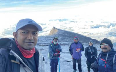Siva Kumar Raghavan (left) poses with some of his climbing partners at the summit of Mount Kinabalu, the tallest peak in Malaysia. Siva pitched the climb to fellow members of the Rotary Club of Melawati as a way to promote organ donation and inspire other dialysis patients.