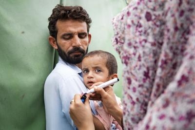 Vacinadora em frente de uma casa em Karachi, no Paquistão, marca o dedo mindinho de uma criança depois de imunizá-la contra a pólio. De janeiro a início de agosto deste ano, 14 casos de pólio selvagem foram confirmados no Paquistão e um no Afeganistão — os dois últimos países onde a doença é endêmica.
