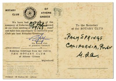 Postcards from Rotary’s archives show how members fulfilled and affirmed their meeting attendance while away from their home clubs. The family of J.G. Clapp, who served as secretary of the Rotary Club of Palm Springs, California, in the 1960s, donated some picturesque cards to Rotary International, including this one from 1968, when a member of the Palm Springs club visited the Rotary Club of Athens.