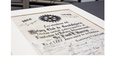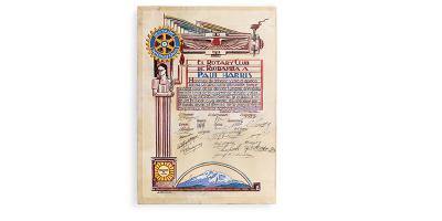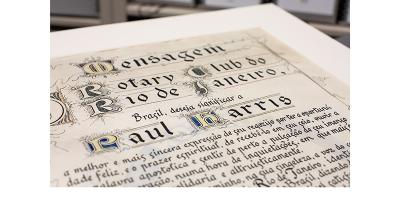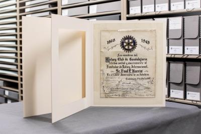 Le Rotary International s'efforce de préserver l'héritage du Rotary et d'honorer les figures clés de son histoire. Nous y parvenons en constituant et en prenant soin des archives qui documentent de manière précise et pertinente l'histoire du Rotary. Dans le cadre de cet effort, les documentalistes du siège mondial du Rotary à Evanston ont travaillé avec un restaurateur d'œuvres sur papier pour traiter quatre pièces artisanales qui furent offertes à Paul Harris.