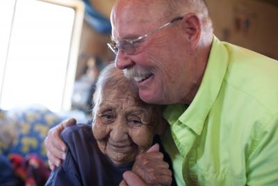 Joe Williams hugs Irene Guerito after installing solar lights in her home on the Navajo reservation.