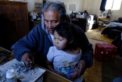 Jerry Domingo shows his granddaughter how he makes jewelry.