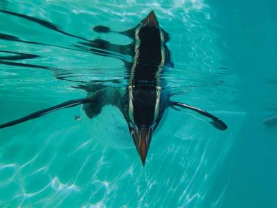 An erect-crested penguin recovers in the rehabilitation pool following a large lower beak injury.