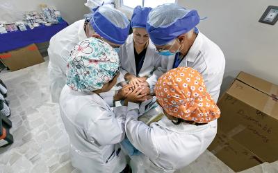 Il dottor Dan Jacob (in alto a sinistra), cofondatore del New Orleans Medical Mission Services, prega con infermieri e assistenti, tra cui la Rotariana Jennifer Esler (in basso a sinistra), prima di recarsi in sala operatoria per un intervento chirurgico durante una missione medica a Puerto Plata, Repubblica Dominicana, il 23 maggio 2022. Verdetto dei giudici: Il momento, la composizione, la luce. Molto semplice e di grande effetto.