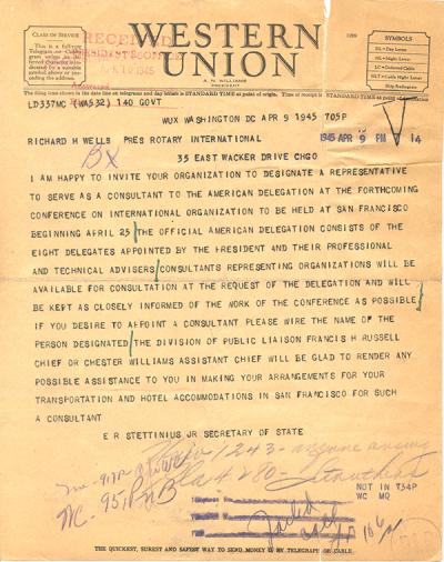 A telegram inviting Rotary International to assist the United States delegation in 1945. Rotary's early involvement with the UN sets the stage for future partnerships with UN agencies.