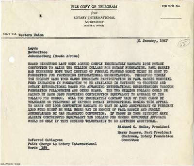 After the death of Paul Harris on 27 January 1947, Rotary sends members a telegram telling them of his desire that, in lieu of flowers, they make contributions to the Foundation.