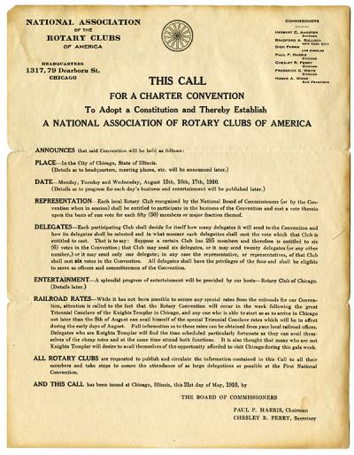 Die Mitglieder von 16 Rotary Clubs kommen 1910 auf der ersten Rotary Convention in Chicago zusammen. Dort gründen sie die National Association of Rotary Clubs of America, verabschieden eine Verfassung und Satzung für die Organisation und wählen einen Vorstand. Als Mitglieder dieser Vereinigung bleiben die Rotary Clubs autonom, teilen aber dieselben Grundwerte.