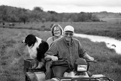 Dorothy and Don Harms with their dog Max in the pasture to move beef cattle.