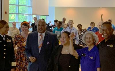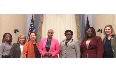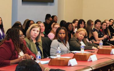 Left: Lawal (left) testifies at a 2023 U.S. congressional hearing in support of a bill related to mental health services in schools. Right: Lawal (second from right) poses with House members and other participants in the hearing. She also testified before the Maryland Legislature in support of a bill related to the 988 crisis hotline. Images courtesy of Mary Lawal.
