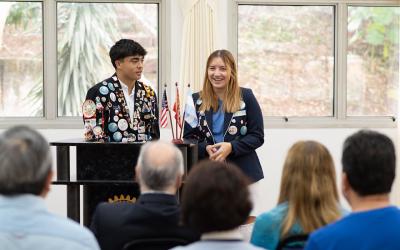 George French, a Rotary Youth Exchange student from Minnesota, USA, and Regina Alesi, from Argentina, participate in a Rotary meeting during their exchanges in Brazil.