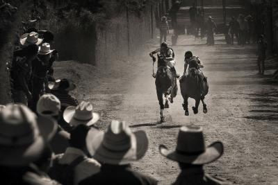 Sinclair: The use of black and white transforms the harsh light into highlights and shadows that emphasize the composition. The cowboy hats in the foreground make a perfect frame for the race.
