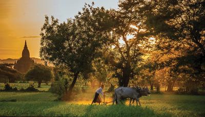 Sinclair: This elegant, classically shot photograph is reminiscent of National Geographic images that focus on magical light and landscapes. The painterly quality of the light makes the image seem timeless, and the combination of the temple in the background, the trees in the foreground, and the person working a plow gives the image a spiritual quality.