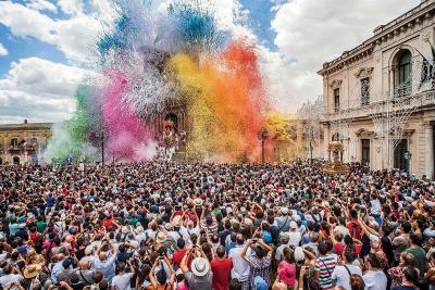 Sinclair: The distance from the color explosion works perfectly within the frame. Most photographers would have tried to be as close as possible, but the distance provides a needed perspective while communicatingto the viewer more information about the event with the surrounding architecture and crowd.