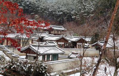Steinmetz: The few bits of color make an otherwise monochromatic scene come alive. The snow adds beautiful texture to the traditional architecture, and the leaves and branches in the foreground create a nice frame. This is a landscape you want to explore.
