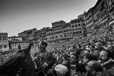 Steinmetz: This photograph perfectly captures a public event at the Palio di Siena, a twice-annual horse race in the heart of the city. The rider’s expression and the faces in the foreground convey a lot of emotion, but then your eye travels around the image and you see the context of the town square. Framing on a tilt makes it feel like you are part of the scene, being jostled in the crowd. It’s a great way to capture the energy of the moment.