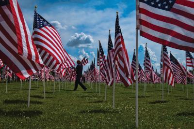 Steinmetz: Newspaper photographers are asked every year to photograph something that conveys the idea of patriotism for Memorial Day; this is an excellent version. The lines of flags create perspective and depth, which makes the person walking through stand out.