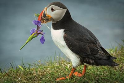 Winter: A simple but lovely puffin portrait with a little something extra to make it unusual and wonderful. These birds are not herbivores, so was it doing a little home decorating? Those sorrowful eyes suggest something more meaningful.